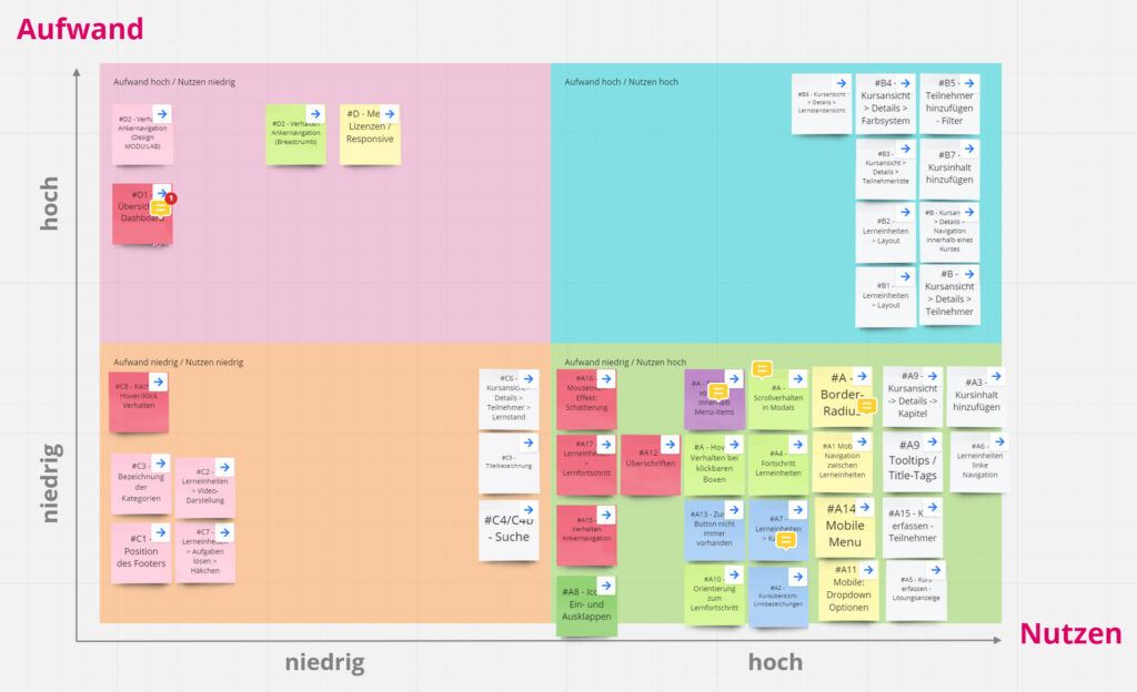 Und was kam dabei heraus? Grundsätzlich bescheinigen uns die Expertinnen, eine beeindruckende und zeitgemässe Lernumgebung gestaltet zu haben – der eine oder andere Bereich sei aber noch nicht optimal bedienbar. Die Befunde clusterten wir nach Kundennutzen bei der Umsetzung und nach Aufwand, um entscheiden zu können, wo genau anzusetzen ist.