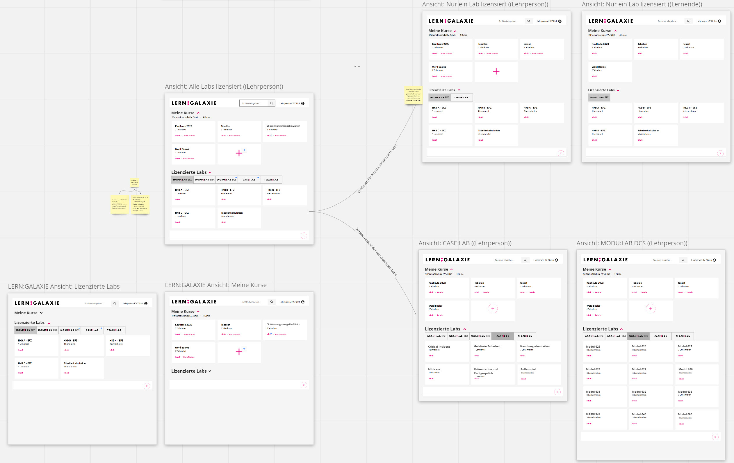 Für die relevantesten Bereiche (Kurszusammenstellung und Kursfortschritt) entwickelten wir in zwei Gruppen und mehreren Teilschritten neue konkrete Lösungen in der Nutzerführung. Diese Lösungsszenarien haben wir mit der Software Miro als interaktive digitale Klickdummys nachgestellt. Verschiedene Screens unseres echten MODU:LAB wurden nachgebaut und miteinander verlinkt. Auf diese Weise konnte der Klickweg Bild für Bild nachgestellt werden.